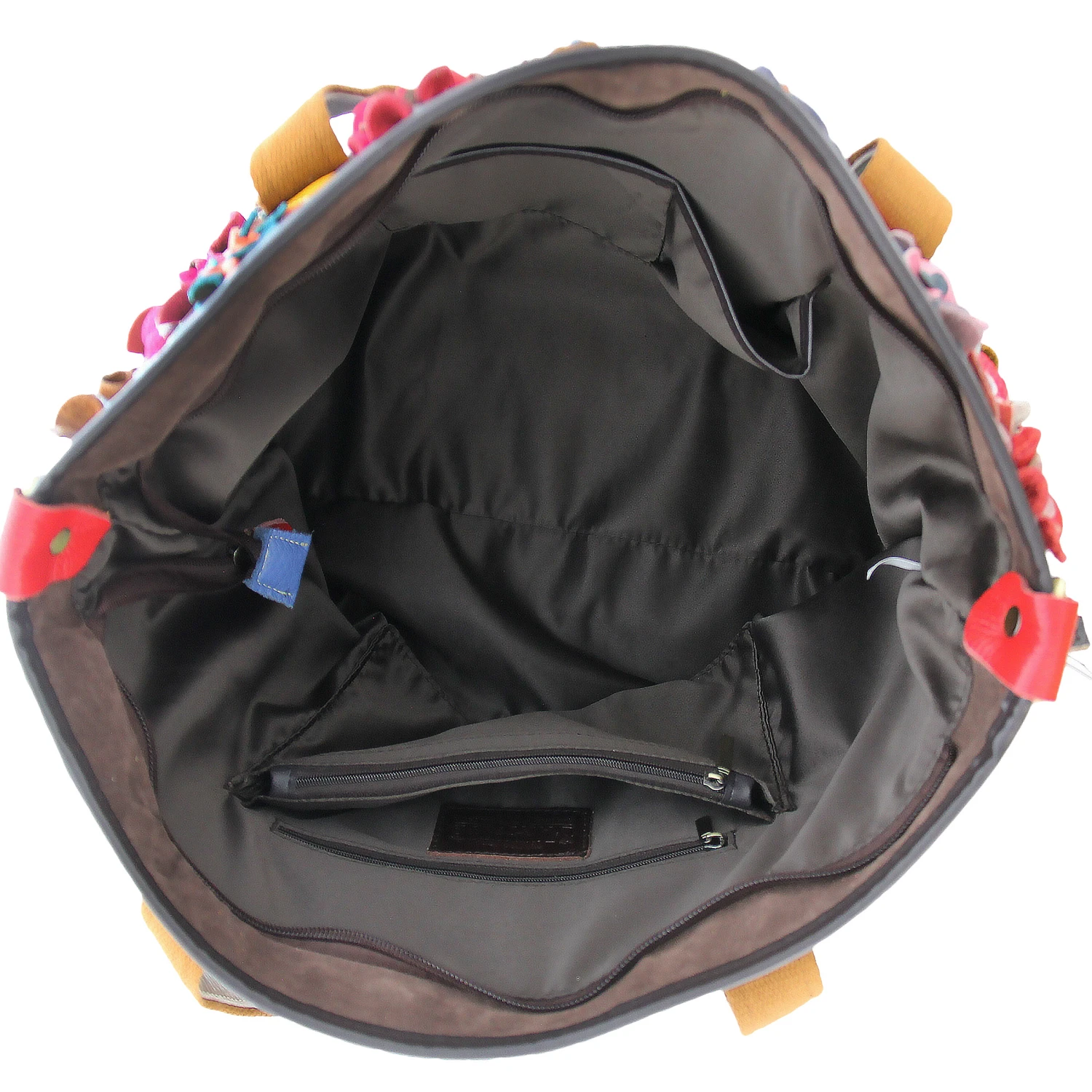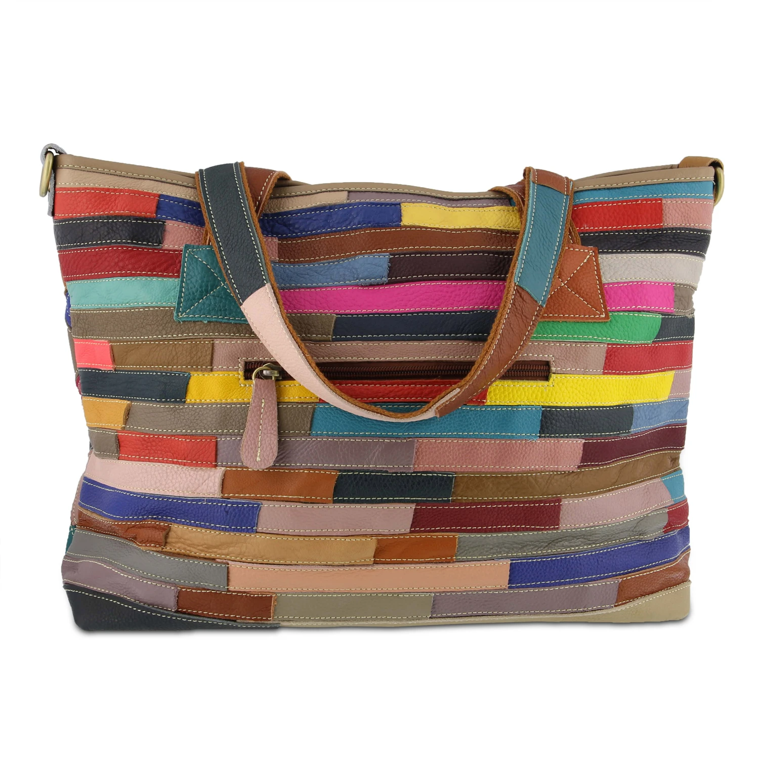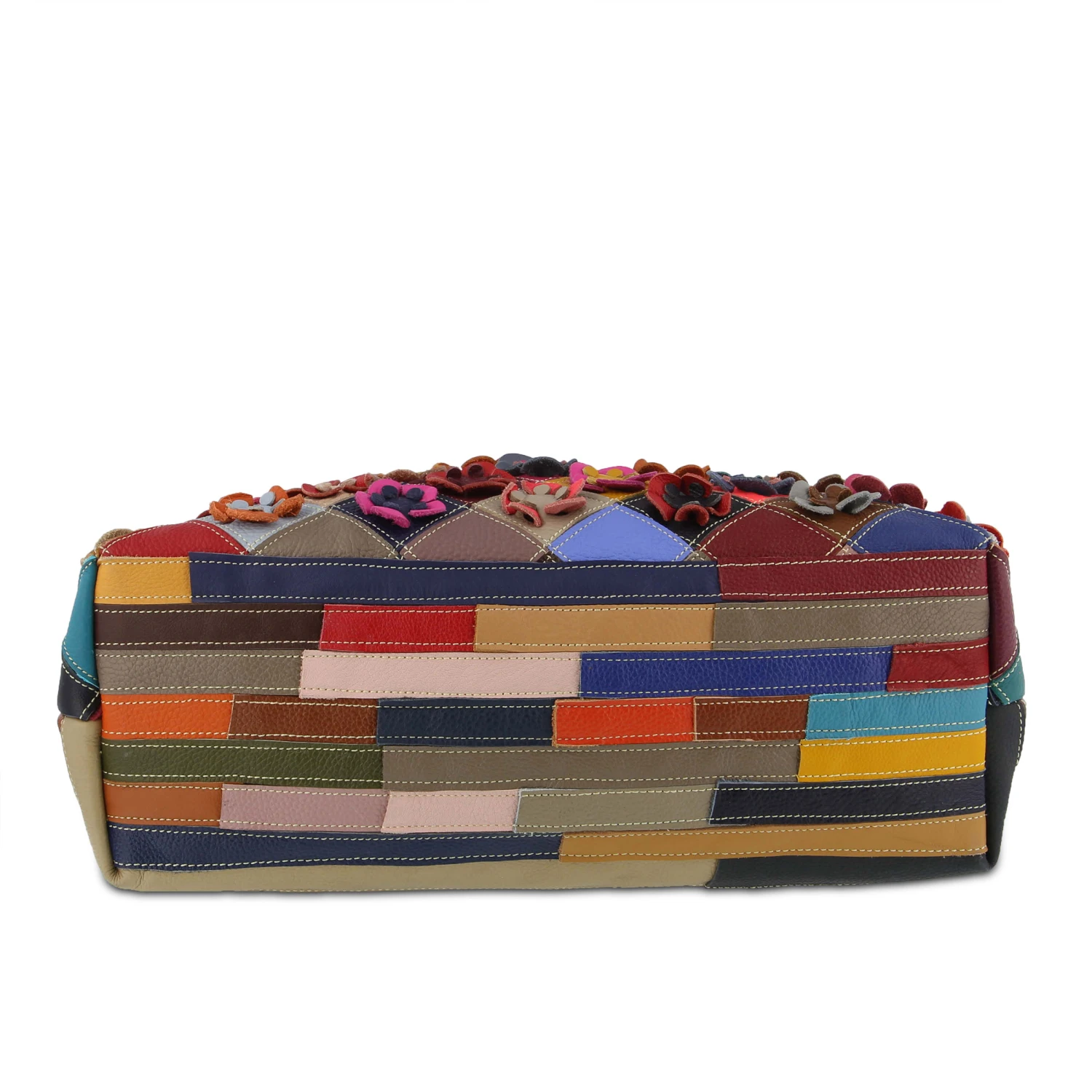 No two totes alike! Colors galore grace the front of your forever blossoming leather flower garden. Wear it to the front to show your love of nature- turn it around for a hand stitched kaleidoscope quilt with center safe keeping zipper pocket. Solid color leather and canvas backed shoulder straps, with detachable/adjustable multi colored leather and canvas cross body strap. Large single interior compartment with 3 wall pouches and double zip wall pockets.