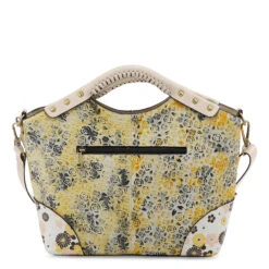 Leather wrapped whipstitched handles showcase all over multi colored yellow and charcoal dimensional embossed roses, along with a trio of 3 D leather upper blooms. Front to back corners of wild mountain carved leather flowers with antiqued brass stud accents and feet. Outside back zip, inside single compartment with wall zipper and open pouches for smaller items. Adjustable shoulder strap and protective storage bag included.