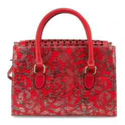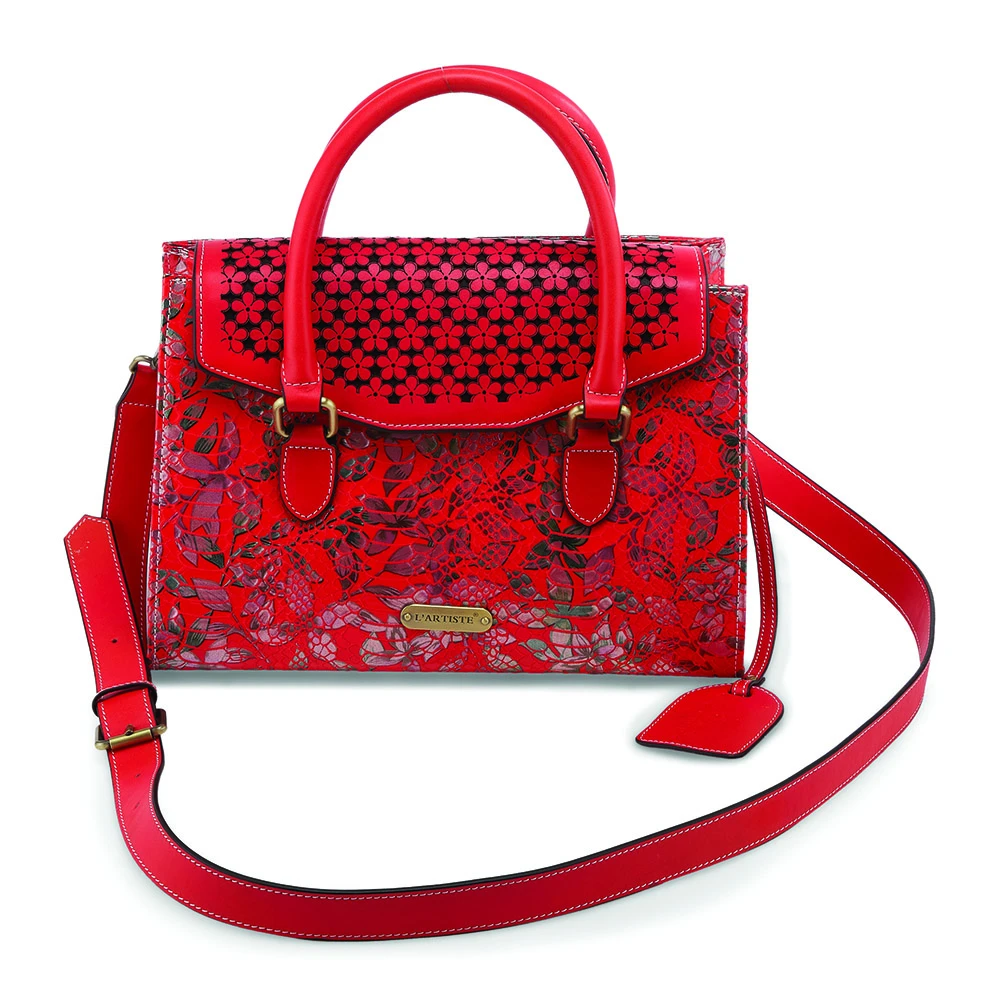 One for the Cosmics; Absract flora and leaf design with an all-over metallic shimmer worthy of tackling the universe with convinction in your day to day life. Pretty leather laser cut-out floweredl flap, opens to a roomy single compartment with 2 inside open pouches and a single zipper walled pocket all beautiffully lined in a soft velvety paisley print. Full size back snap slip velvet paisley lined pocket adds to the perfection of this structured fashion satchel with ‘out of this world’ function. Removable leather adjustable shoulder/crossbody strap and leather rolled handles for even more versatility and 3 fabulous color choices for all your moods.