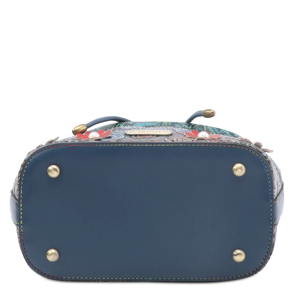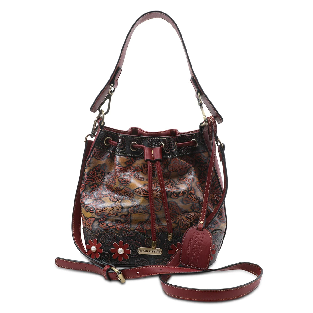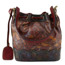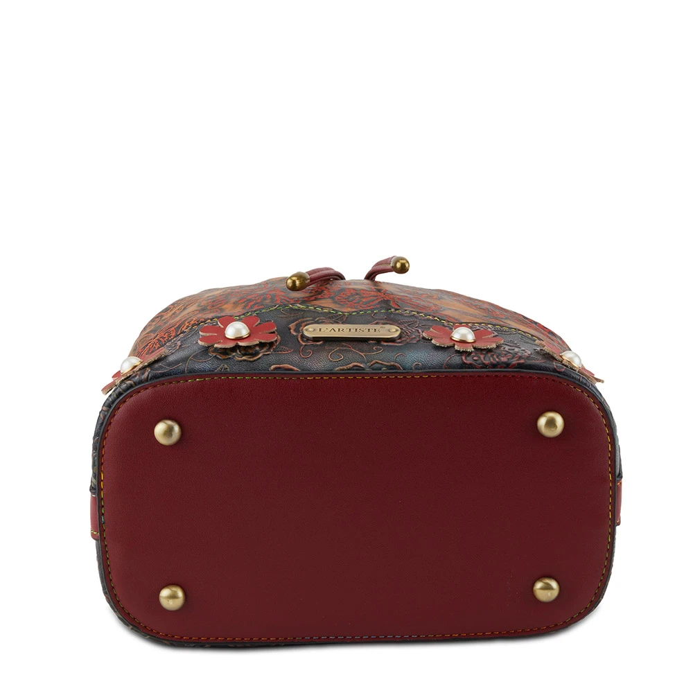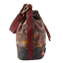 The subtle symbolism of the transformation for starting anew! Traditional drawstring bucket bag takes on a whole new meaning with the central leather motif of fluttering butterflies, trimmed at the top with a 3-dimensional multi-colored rose print and a wider dimensional rose base with pearl centered leather daisies. Brass footed leather base sits upright and strong, opening wide revealing a velvet paisley printed lined single compartment with opposite dual pockets for smaller items and a choice of 2 removable leather straps. Cottony storage dust bag included.