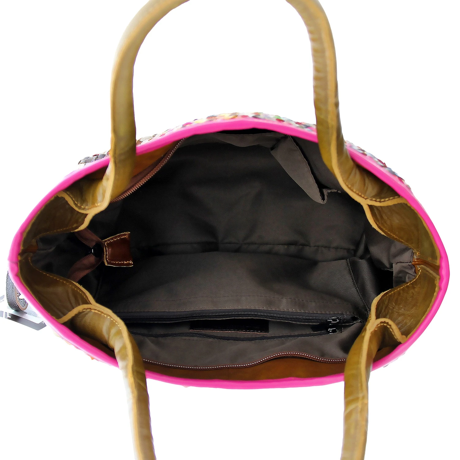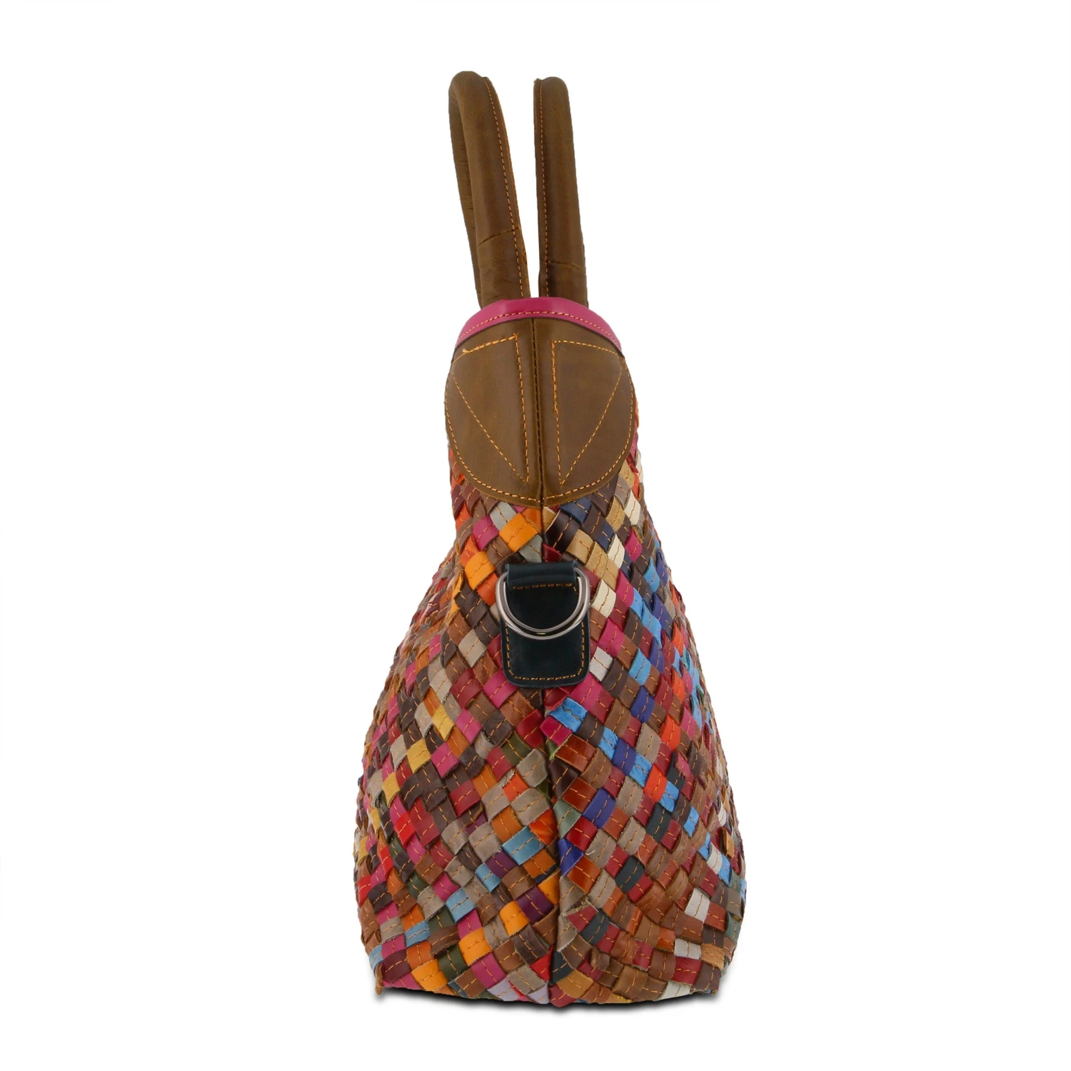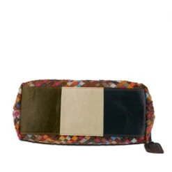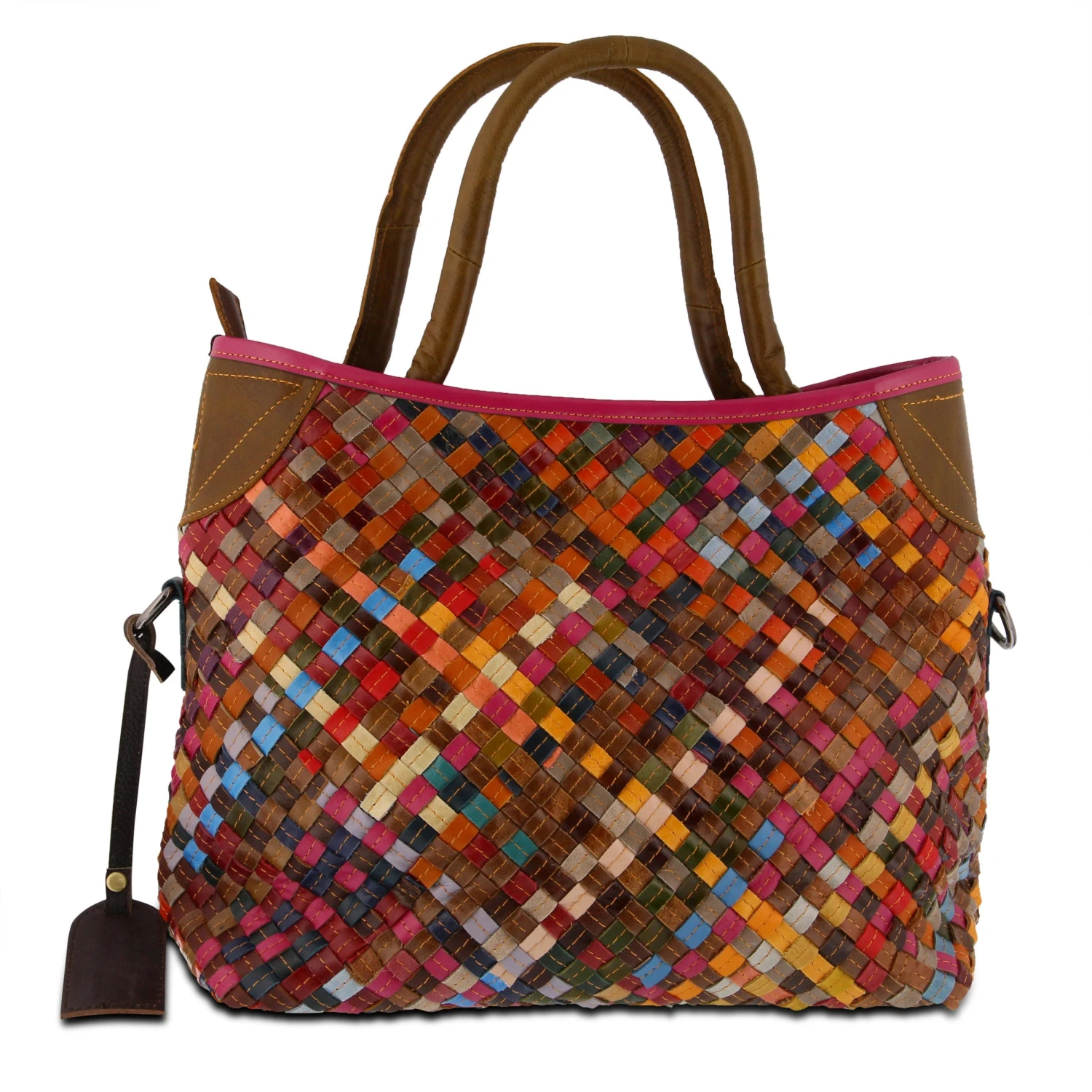 Colorful tote with 3 dimensional stitched multi colored leather basket weave pattern. Contrasting leather, deeply inset rolled handles and adjustable, detachable multi colored leather and canvas combination cross body strap. Single compartment with easy to clean nylon lining, inside wall zip pocket and 2 opposite open wall pouches.