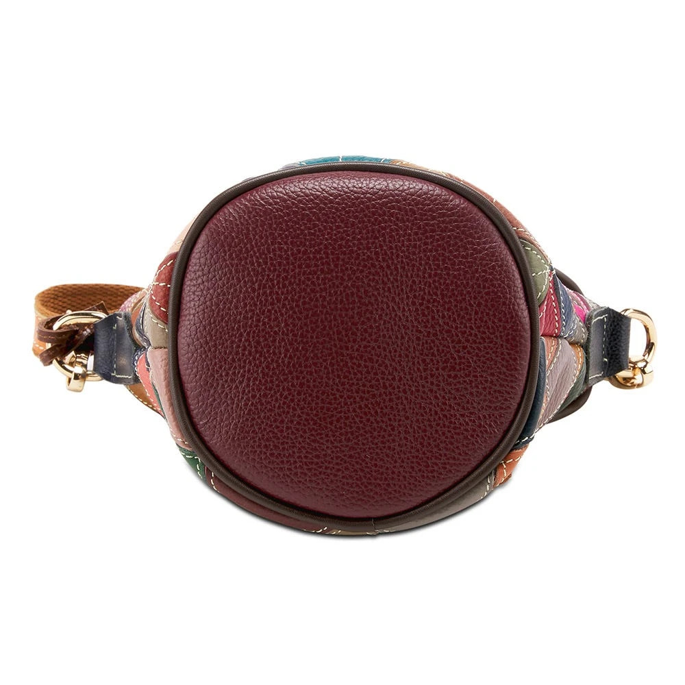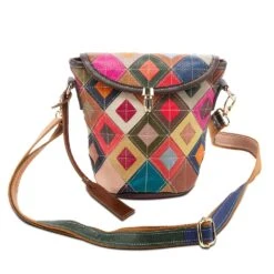 Vintage inspired cuteness in a crossbody or shoulder zip top flapped bucket style bag featuring inside single compartment with 1 inside wall zipper pocket and 1 inside wall pouch. Room enough for a full sized wallet, phone, keys, lipstick and ….! Leather stitched multi colored diamonds within diamonds on both front and back, separated by outside back zipper pocket blending into larger single layered leather diamond patches. Adjustable cotton canvas and leather patched strap, contrast leather trim and solid circular leather bottom.